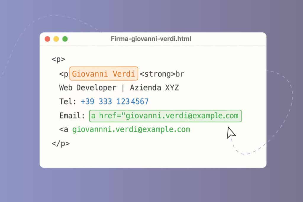 Un dettaglio importante: modifica l’indirizzo email sia nella parte mailto: sia nella porzione visibile subito dopo il simbolo >. Non alterare né eliminare altri tag HTML, altrimenti la firma potrebbe non essere visualizzata correttamente.