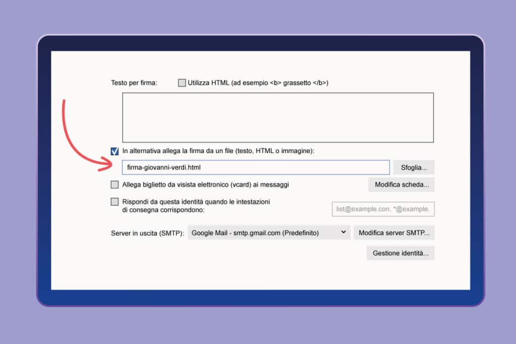 Nella sezione dedicata alla firma, seleziona “In alternativa, allega la firma da un file (testo, HTML o immagine)”, poi clicca su Sfoglia e carica il file HTML appena modificato.